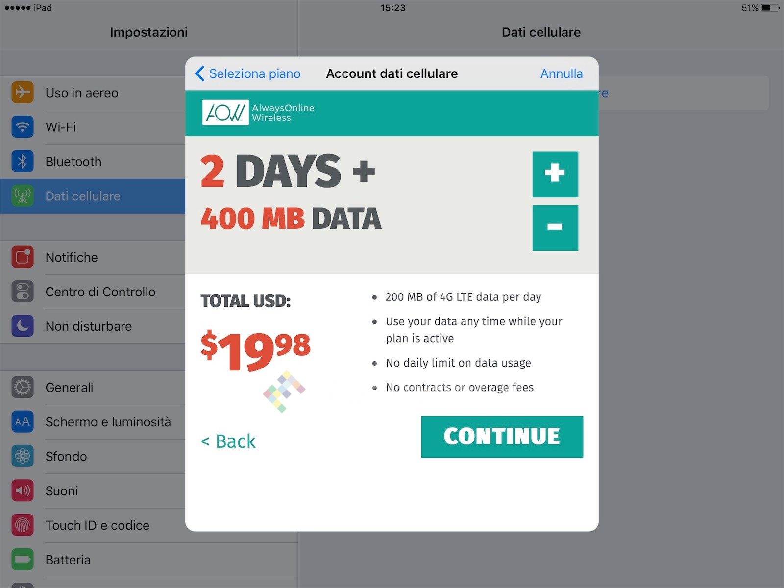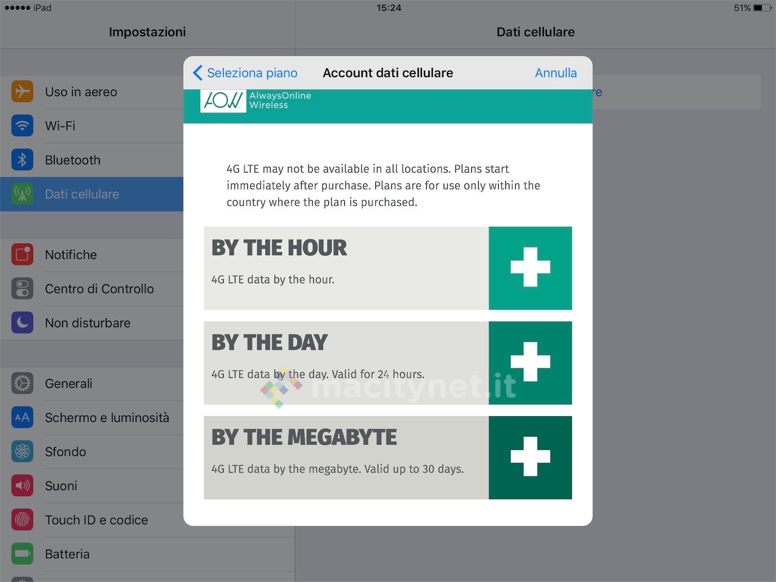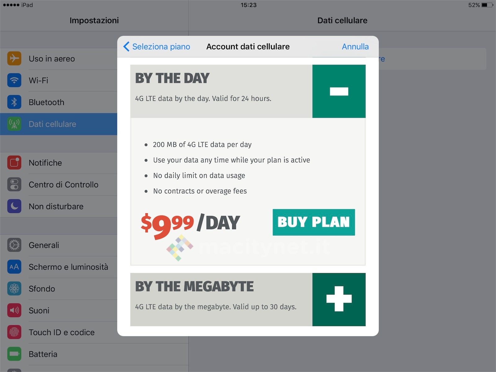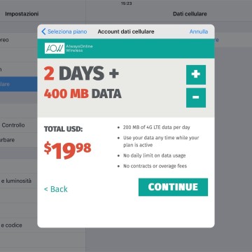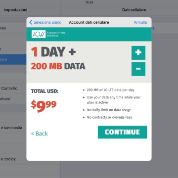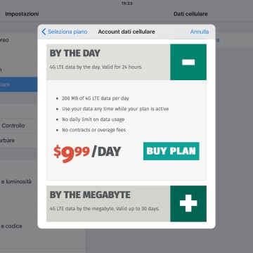 Naturalmente gli Italiani che si trovano all’estero possono già da ora utilizzare subito iPad Pro 9,7” e Apple SIM digitale. È bello finalmente poter dimenticare in un colpo solo SIM card nostrana e soprattutto i piani dati in roaming dei nostri operatori. Arrivati a Parigi, Londra o pochi km fuori dai nostri confini, basta accendere iPad, entrare in Impostazioni e Dati Cellulare: un tap e sullo schermo scorrono piani pensati in bocconcini mordi e fuggi, con tempo e traffico in quantità utili proprio per permanenze brevi o comunque temporanee. Niente visita obbligata al sito web o al negozio dell’operatore, niente perdite di tempo per clausole e limiti di traffico da cruciverba, tipiche invece dei piani pensati per “bloccare” gli utenti per lunghi periodi o per sempre o quasi.