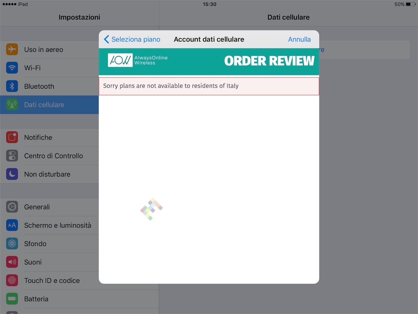 Come ci aspettavamo già all’inizio del test, non è stato possibile completare l’acquisto del pacchetto dati perché il sistema rileva l’indirizzo di fatturazione in Italia della nostra carta di credito: le offerte oggi possibili con Apple SIM digitale sono riservate per chi si trova all’estero. Così i piani prima visualizzati e proposti risultano disponibili solo per turisti e viaggiatori di altre nazioni che si trovano sul territorio italiano.