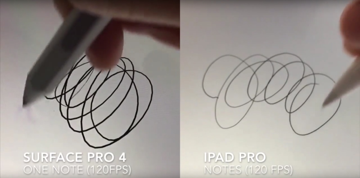 Nel primo l’autore spiega come è stato realizzato il confronto: su Surface Pro 4 scarseggiano le app che offrono un rilevamento accurato e rapido dello stilo, così è stata scelta l’app Microsoft One Note che non rileva l’inclinazione ma fa il suo lavoro. Invece su iPad Pro l’app impiegata è quella delle Note, già pronta per l’uso con Apple Pencil. A velocità normale ed osservando dal vivo lo schermo dei due tablet mentre si scrive con i rispettivi stilo non emergono grandi differenze.