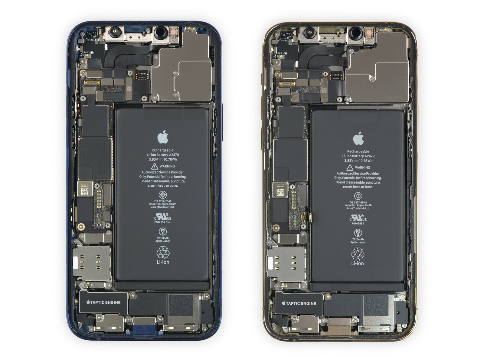 Sulla scheda logica a “L” si evidenza la presenza dell’A14 Bionic, unità di flash storage da 64GB (probabilmente prodotta da Samsung), il transceiver LTE Qualcomm SDR865 5G, il modem/sistema RF Qualcomm SDX55M 5G, un circuito integrato SMR526, il chip ultrawide band U1 di Apple, il duplexer Avago 8200, il circuito integrato di power management APL109 4343S00437 di Apple.