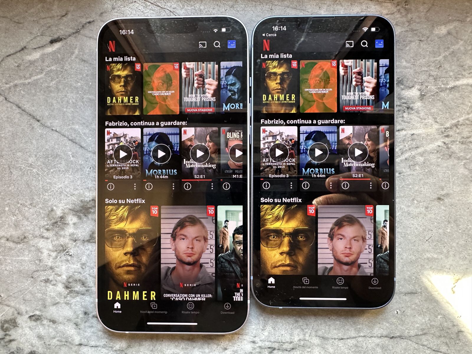 La riduzione della luminosità rispetto ad iPhone 14 Pro (800 nits contro 1000 nits di luminosità massima, 1000 contro 1200 nits di luminosità di picco) non è particolarmente evidente. Probabilmente in piena luce con un cielo terzo che si specchia dentro allo schermo potremmo avere meno qualità ma nell’uso quotidiano la differenza appare davvero minima se non inesistente ad occhio nudo.