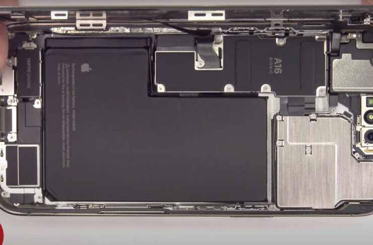 Una volta sollevato il display, la visuale dall’alto conferma la grande somiglianza con iPhone 13 Pro Max delle componenti interne e anche nella loro disposizione generale, ma emergono anche interessanti differenze. La batteria a forma di L è come sempre la singola componente che occupa più spazio, ed ora arriva la conferma della potenza di 4.323 mAh, leggermente inferiore ai 4.352 mAh di iPhone 13 Pro Max.
