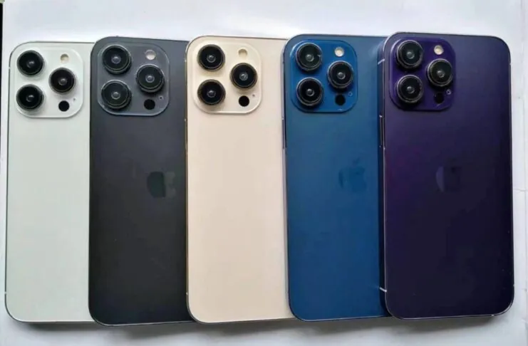 Le immagini dei modelli fittizi di iPhone 14 Pro sono state condivise per la prima volta su Weibo e mostrano opzioni di colore oro, grafite e argento simili ai modelli degli ultimi anni. Altre due opzioni di colore raffigurate nell’immagine sarebbero nuove per l’attuale linea di iPhone “Pro”: un viola scuro e il blu.