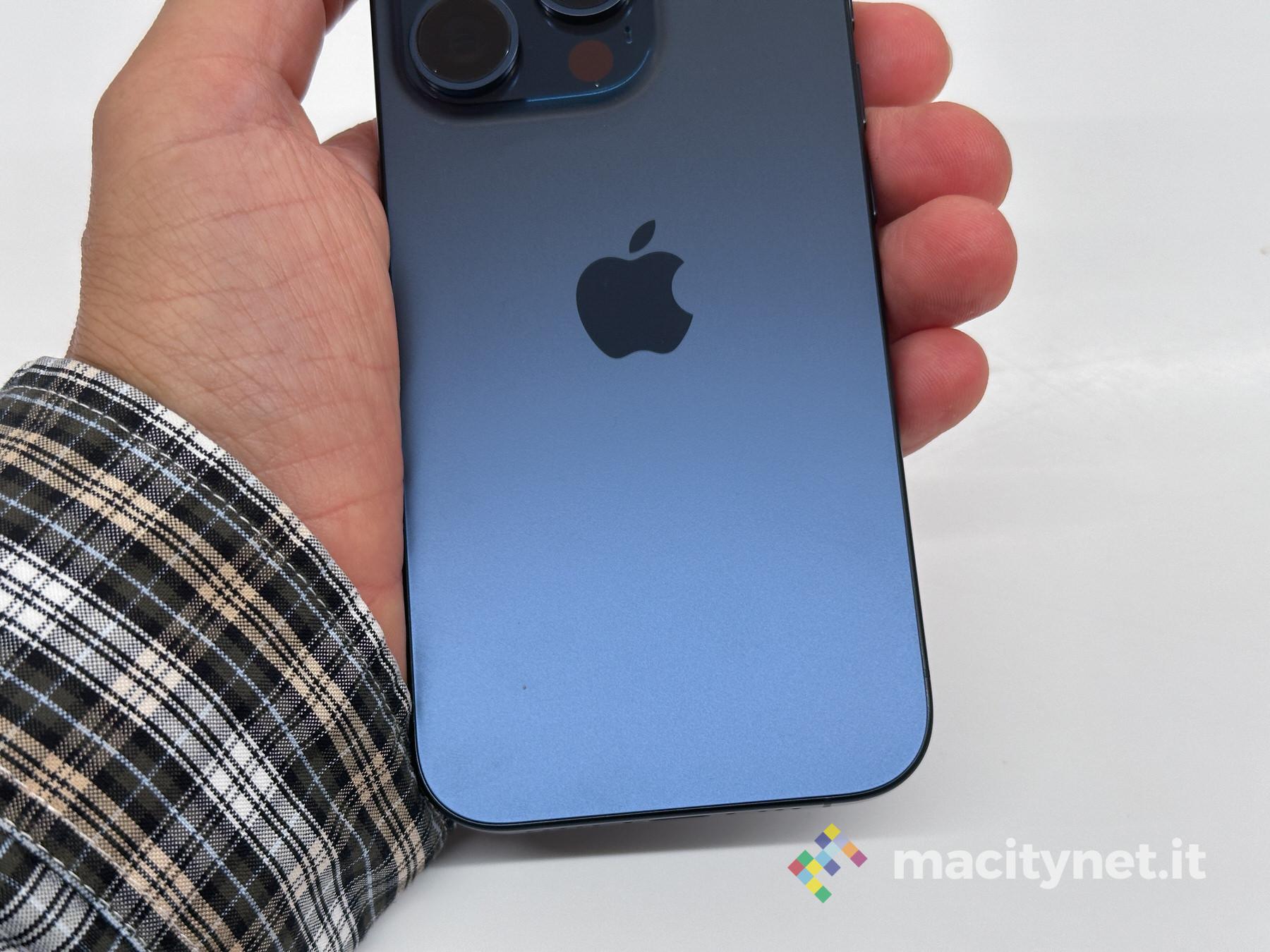 L’effetto cromatico è totalmente differente da quello del blu pacifico un po’ spento di iPhone 12 Pro. L’incidenza della luce produce variazioni nella tinta dall’azzurro elettrico ad un grigio virato al blu scuro.