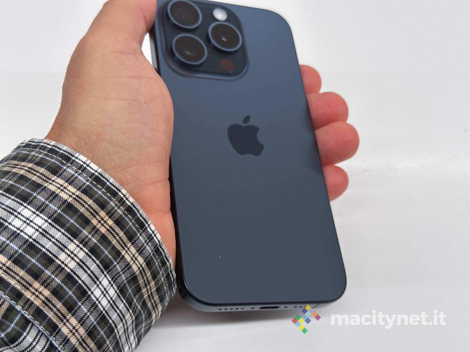 La sensazione, oltre che dal determinante contributo del peso, è suscitata anche da un differente bilanciamento e probabilmente anche dalla forma smussata dei bordi. iPhone 15 Pro Max pur non così comodamente come iPhone 15 Pro si regge e si usa anche con una mano.