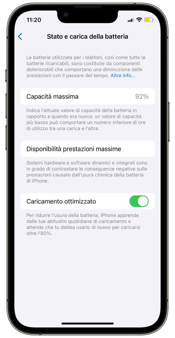 Invece il comportamento è leggermente diverso con l’impostazione esistente da anni Caricamento ottimizzato. Attivandola infatti la carica viene portata all’80%, ma il sistema porterà alla ricarica completa nelle ore immediatamente precedenti all’utilizzo da parte dell’utente, in base agli orari e abitudini rilevati.