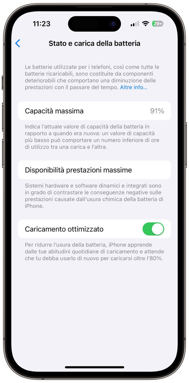 Anche attivando la nuova impostazione con limite carica 80% negli iiPhone 15 alcuni hanno già osservato che in realtà a volte il terminale ricarica anche a percentuali superiori. La nuova impostazione, così come la precedente, si trova in Impostazioni – Batteria – Stato e carica della batteria.