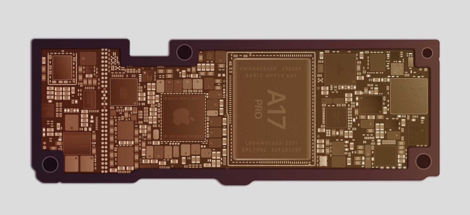 Ma ci sono anche altre tre versioni speciali chiamate Golden Blue, Teal Forest e Umber in cui le tonalità che appunto virano sul blu, sul verde o sull’ambrato sono accostate da una sezione dai colori più accesi che mette in maggiore evidenza il chip del processore A17 insieme agli altri piccoli componenti circostanti.