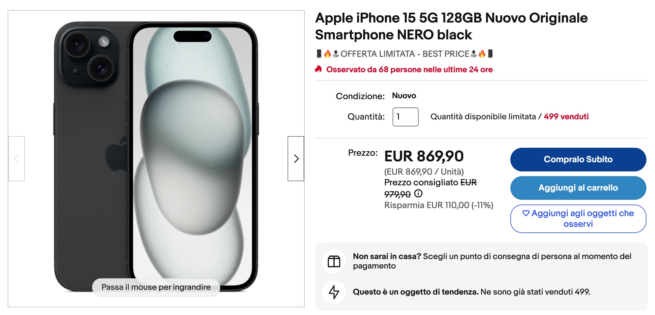 Come abbiamo accennato, comprare iPhone 15 su eBay permette di risparmiare 185 € per la versione da 128 GB. Lo pagate infatti 794€ nella bellissima colorazione nera (qui altri colori) basta usare il codice NOVEDAYS nel carrello. Il venditore Cellularpont Shop, un venditore professionale che partecipa a tutti gli eventi promozionali ufficiali di eBay. La spedizione è gratuita e avviene in due giorni.