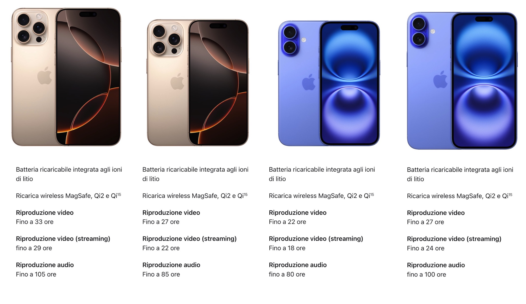 Il vero vantaggio che potrebbe spingere molti ad accettare dei compromessi è nell’autonomia. In questo caso iPhone 16 Pro Max è imbattibile: offre fino al 30% in più di durata di iPhone 16 Pro e anche del 20% più di iPhone 16 Plus.