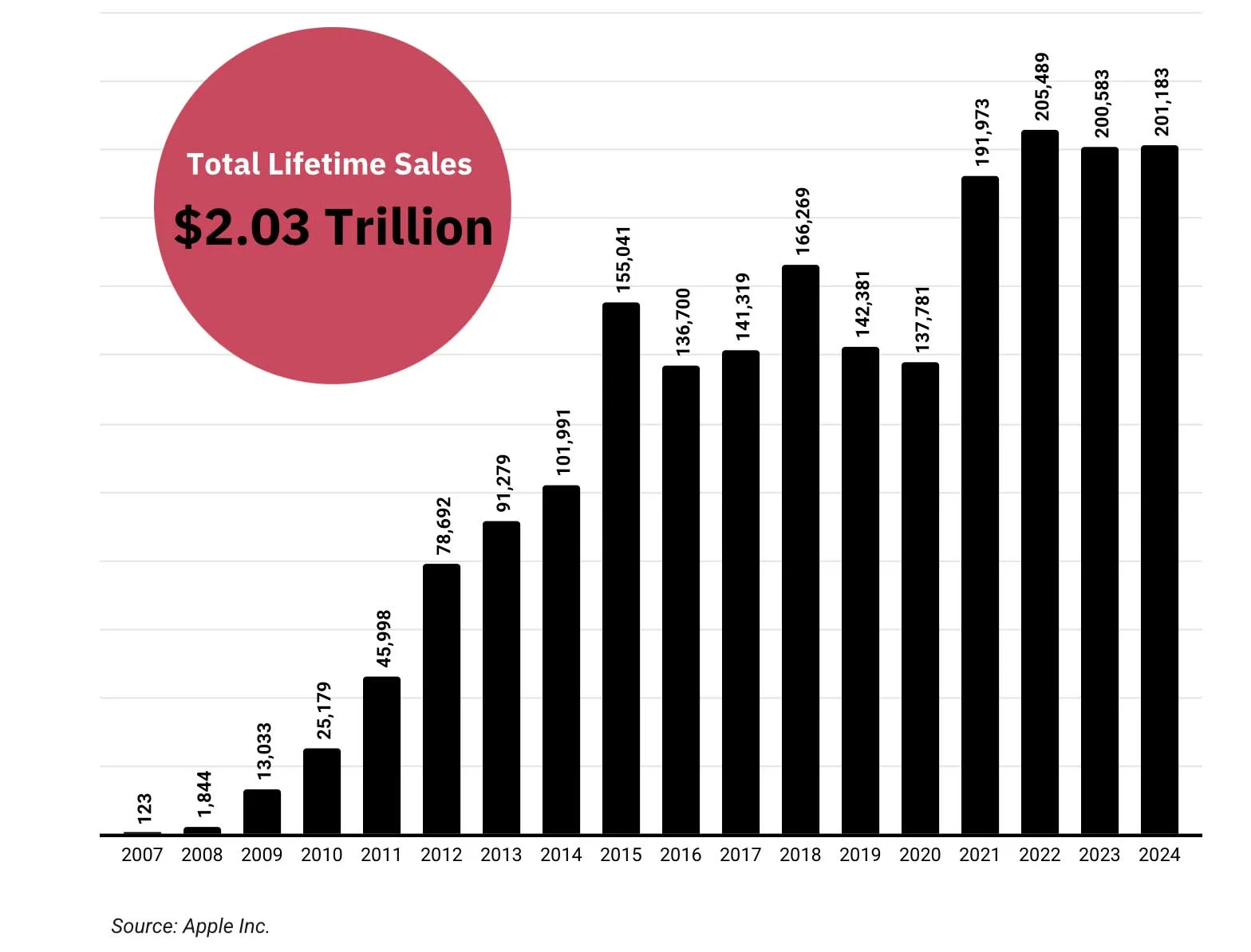 Rispetto al mercato e-commerce statunitense, l’iPhone da solo ha generato quasi il doppio del valore di un anno intero dello shopping online americano. Di particolare rilievo il fatto che Apple ha incassato il doppio delle entrate spese dalla NASA nel corso della sua storia: Apple avrebbe potuto creare 13 Stazioni Spaziali Internazionali (ISS) da 150 miliardi di dollari cadauna, tutte finanziate dalle vendite di iPhone.