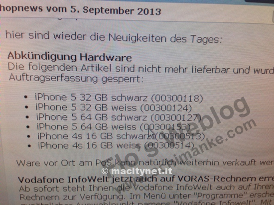 L’email di Vodafone Germania conferma un’indiscrezione già diffusa sull’operatore canadese Telus, che  suggerisce l’idea che Apple potrebbe tagliare le versioni di fascia alta di iPhone 5, ma non quella da 16 GB. In base alle informazioni disponibili fino ad oggi la prossima “line-up” di Apple per iPhone dovrebbe, quindi, essere composta da iPhone 5S come smartphone di punta, iPhone low-cost “5C”, e l’iPhone 5 in versione da 16GB.