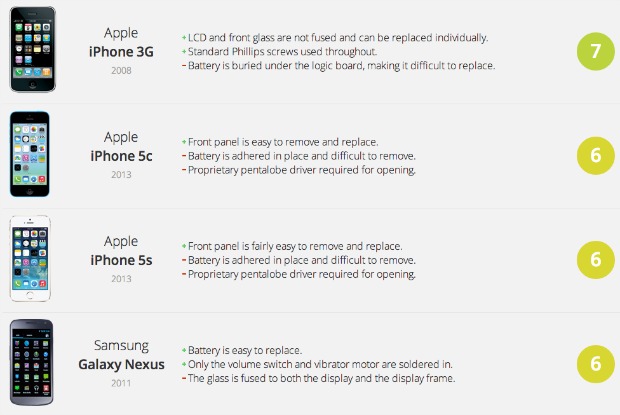 I due nuovi iPhone ottengono un punteggio appena sufficiente a causa della difficoltà nella rimozione della batteria e per l’uso delle viti proprietarie pentalobate, ostacoli nel caso si volesse riparare un iPhone 5C e 5S, peggio rispetto a iPhone 5 o ai più anziani iPhone 3G o 3GS, che avevano totalizzato almeno 7 su 10. A confronto il Samsung Galaxy S4, S3 e S2 ottengono un punteggio di 8 su 10, risultando più semplici da riparare. I due dispositivi migliori sotto questo punto di vista sono i due Motorola Atrix 4G e Droid Bionic, che ottengono 9 su 10; smartphone che brillano sulla riparabilità, un po’ meno nelle vendite.