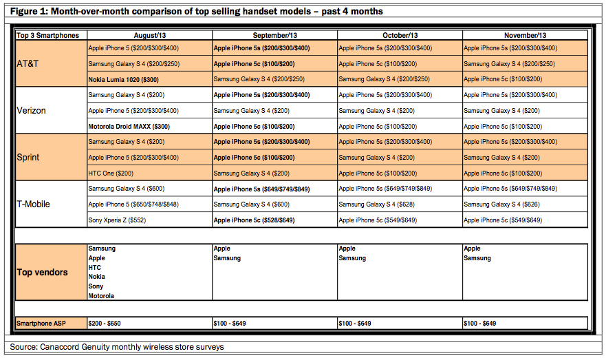 Secondo le rilevazioni della società di analisi, iPhone 5s è stato di gran lunga lo smartphone più venduto per tutti i quattro operatori AT&T, Verizon, Sprint e T-Mobile; allo stesso modo le possibilità offerte dalle differenti colorazioni di iPhone 5c dimostrano un certo apprezzamento da parte del pubblico anche del nuovo modello, in USA comunque più economico del 5s, raggiungendo un certa popolarità nelle vendite.