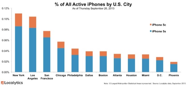 La maggior parte dei nuovi dispositivi è stata acquistata nelle più grandi città americane con New York, Los Angeles, San Francisco e Chicago in testa. Di tutti gli iPhone attivi a New York (compresi i modelli più vecchi come iPhone 5 e iPhone 4S), circa lo 0,11% sono o il 5S iPhone o iPhone 5C.
