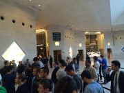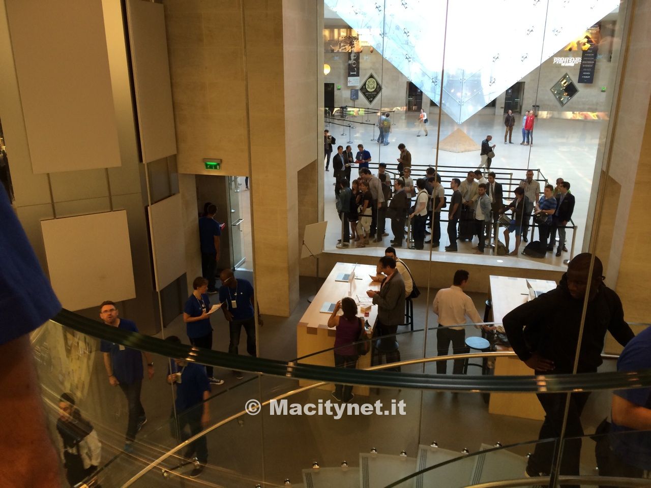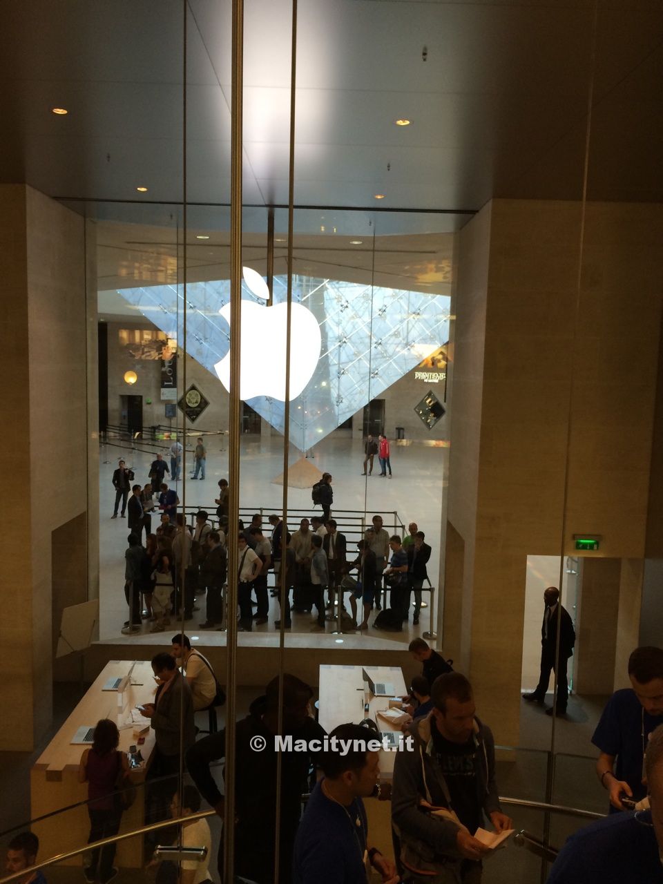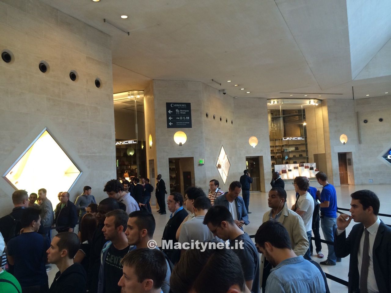 Apple ha diviso in due file i clienti, contro il muro sulla destra chi non ha la prenotazione e qui, sulla sinistra proprio in mezzo al Carrousel du Louvre, proprio davanti alla Piramide di fronte all’ingresso dell’Apple Store, i clienti con prenotazione