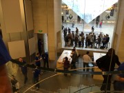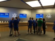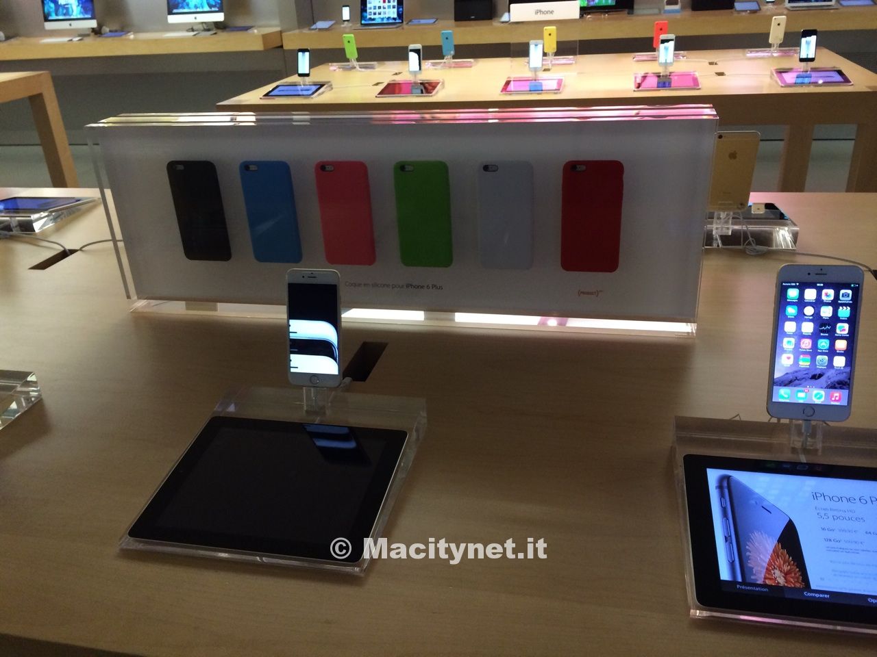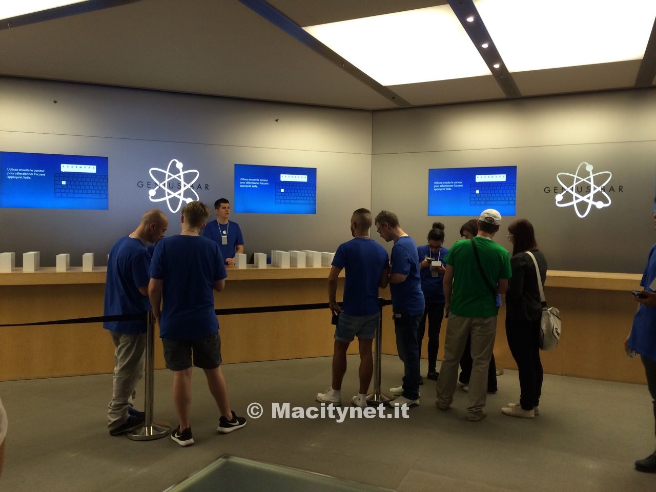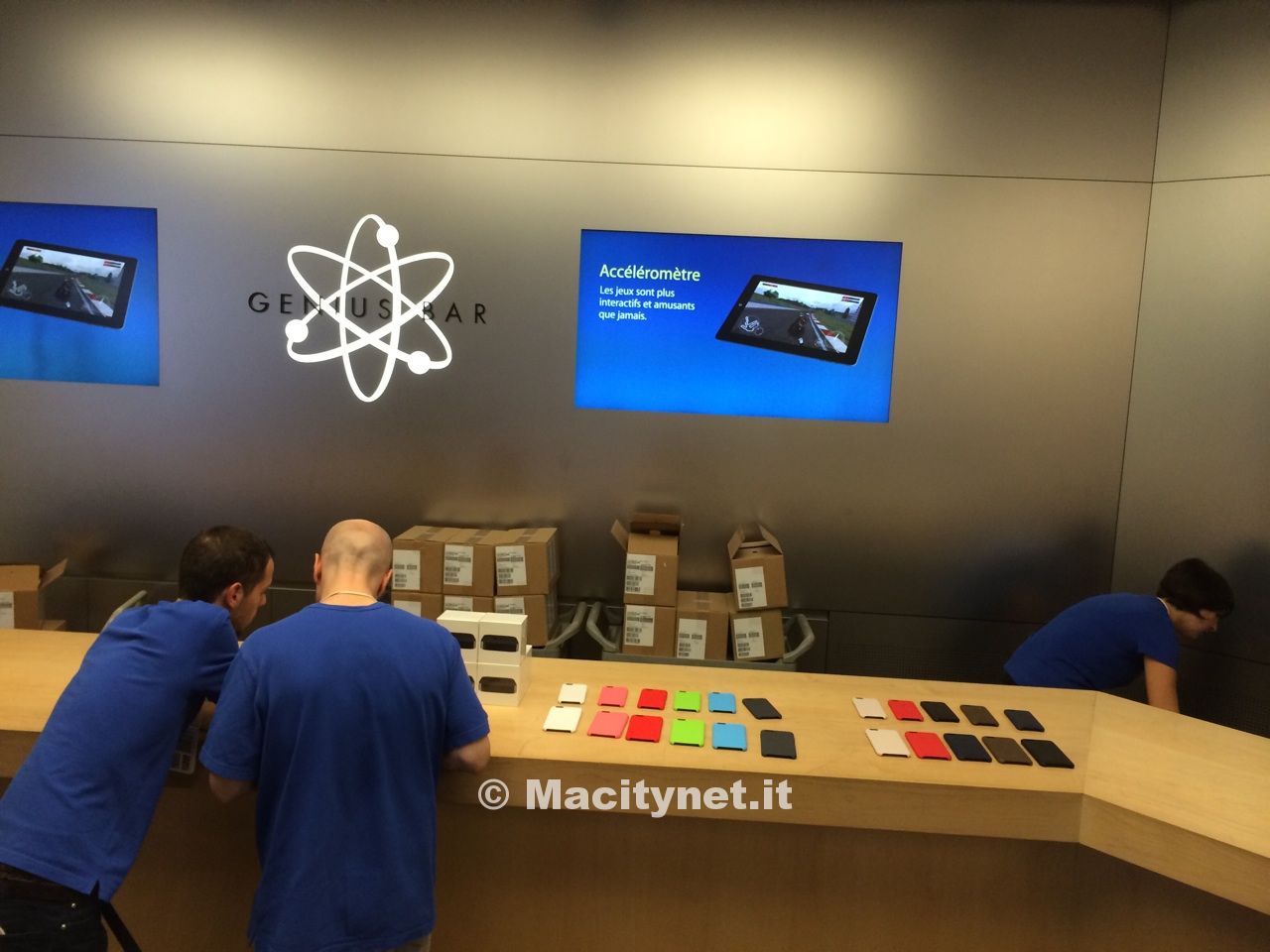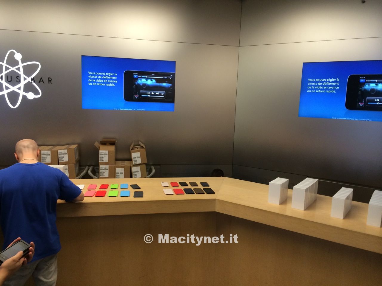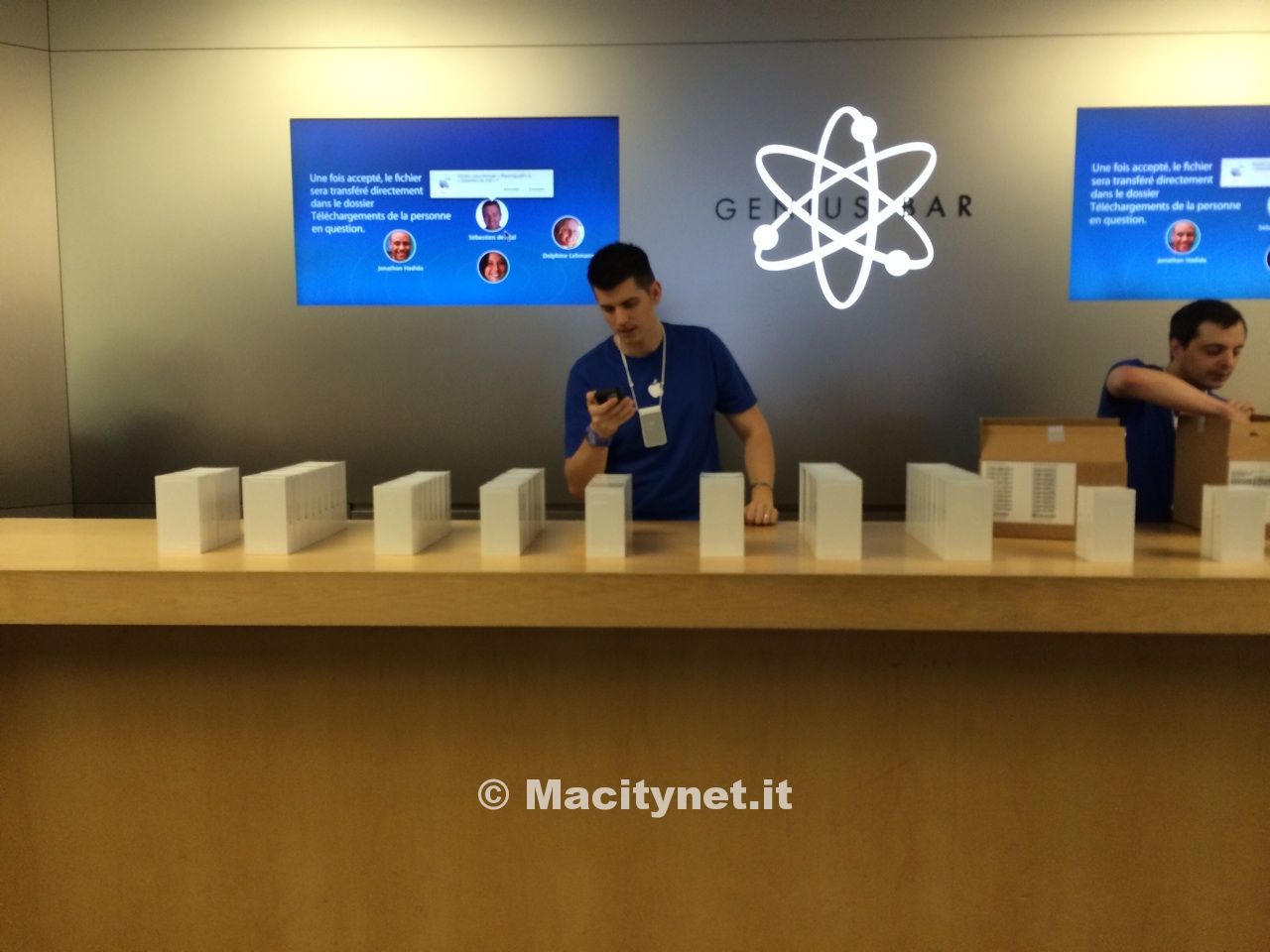 Sul bancone della Genius Bar sono stati già posizionate, in verticale, tantissime scatole dei nuovi iPhone, disposte esternamente quelle dell’iPhone 6 Plus ed internamente quelle di iPhone 6, generando così una sorta di “onda”. Sul tavolo anche le nuove custodie in pelle ed in silicone, divise sul bancone per colori e caratteristiche, dando così al cliente la possibilità di toccare con mano entrambe le versioni.