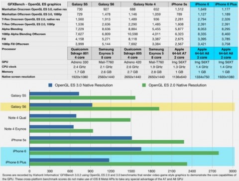 Prestazioni hardware da urlo, processori da 8 core ma nel comparto grafico i nuovi Samsung Galaxy S6 rimangono a lunga distanza da iPhone 6 e Plus. Di più: negli stessi test i costosi terminali top di gamma di ultima generazione di Samsung vengono superati da iPhone 5s lanciato da Apple oltre un anno e mezzo fa.