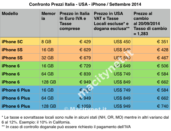 Qui trovate una tabella che illustra il costo dei modelli venduti senza abbonamento negli Stati Uniti e l’equivalente al cambio del 20 Settembre 2014. E’ da tenere conto che nella maggior parte degli Stati USA viene aggiunta una tassa locale che può arrivare al 12%. Fortunati coloro che possono acquistare il telefono in Montana, New Hampshire e Oregon visto che le tasse locali sono nulle in quegli stati. La tassa applicata a New York è dell’8,775%.