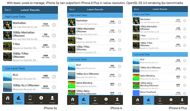 Avendo quindi più pixel da gestire, ne consegue un framerate più basso rispetto alle prestazioni che si possono ottenere su iPhone 5S alla risoluzione nativa: per la precisione, il punteggio ottenuto su iPhone 6 Plus è del 22% inferiore a quello del 5S, mostrando la scena “Manhattan” disponibile nell’applicazione sopracitata a 19 frame al secondo (con risoluzione interna 2.208 x 1.242 pixel scalata a 1.920 x 1.080 pixel) contro i 24,4 FPS di iPhone 5S (con risoluzione 1.1.36 x 640 pixel): leggermente migliore su iPhone 6, dove la stessa scena viene riprodotta a 26,6 FPS a risoluzione 1.334 x 750 pixel, circa il 9% maggiore rispetto a quella del 5S.