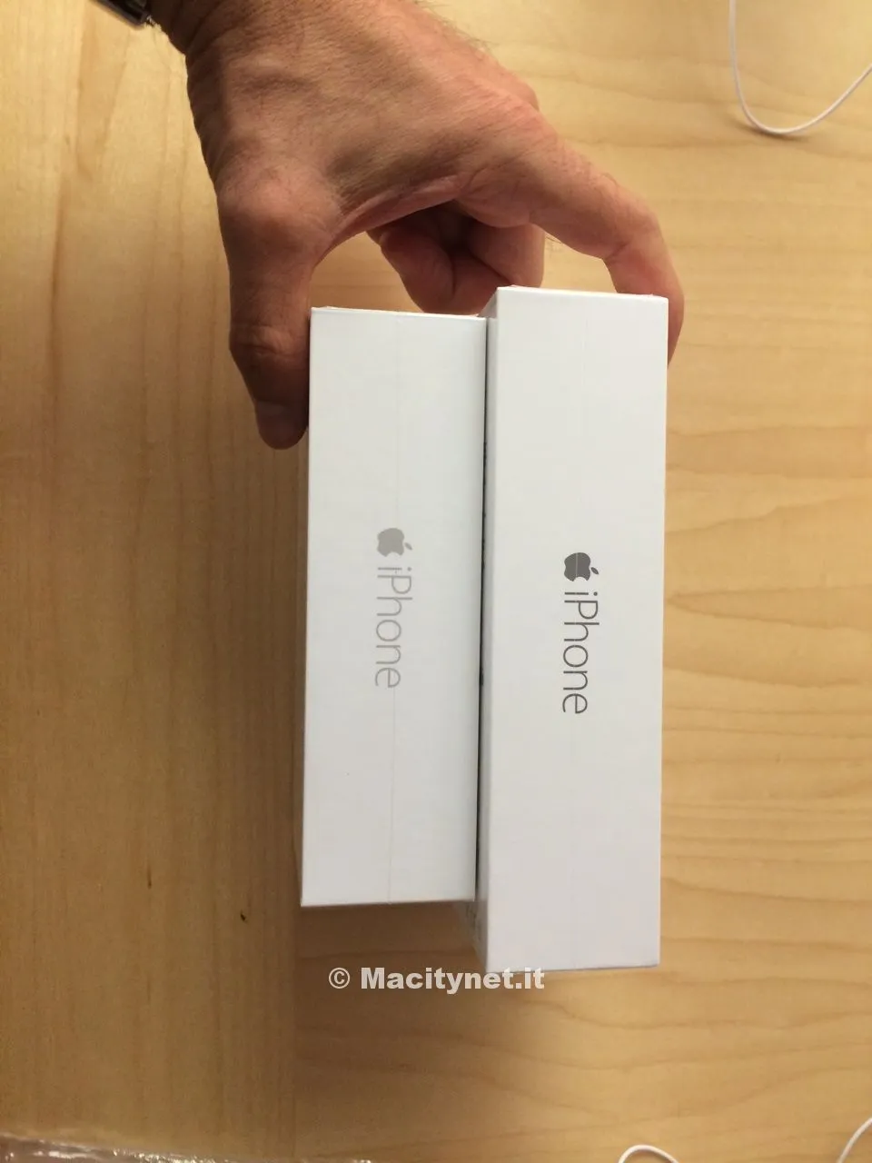 Decisamente più grande, per ovvie ragioni, quella dell’iPhone 6 Plus che sembra differire dalla scatola dell’iPhone 6 anche nel colore della scritta “iPhone 6” sul lato, più scura e marcata nel primo, di un grigio più slavato nel secondo, così da facilitarne il riconoscimento anche se non si ha la possibilità di confrontare le due diverse scatole in base alla misura.