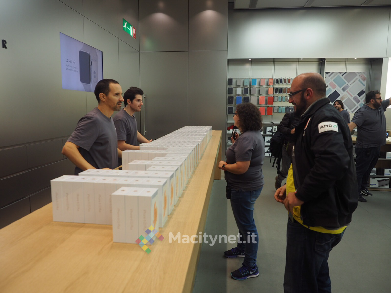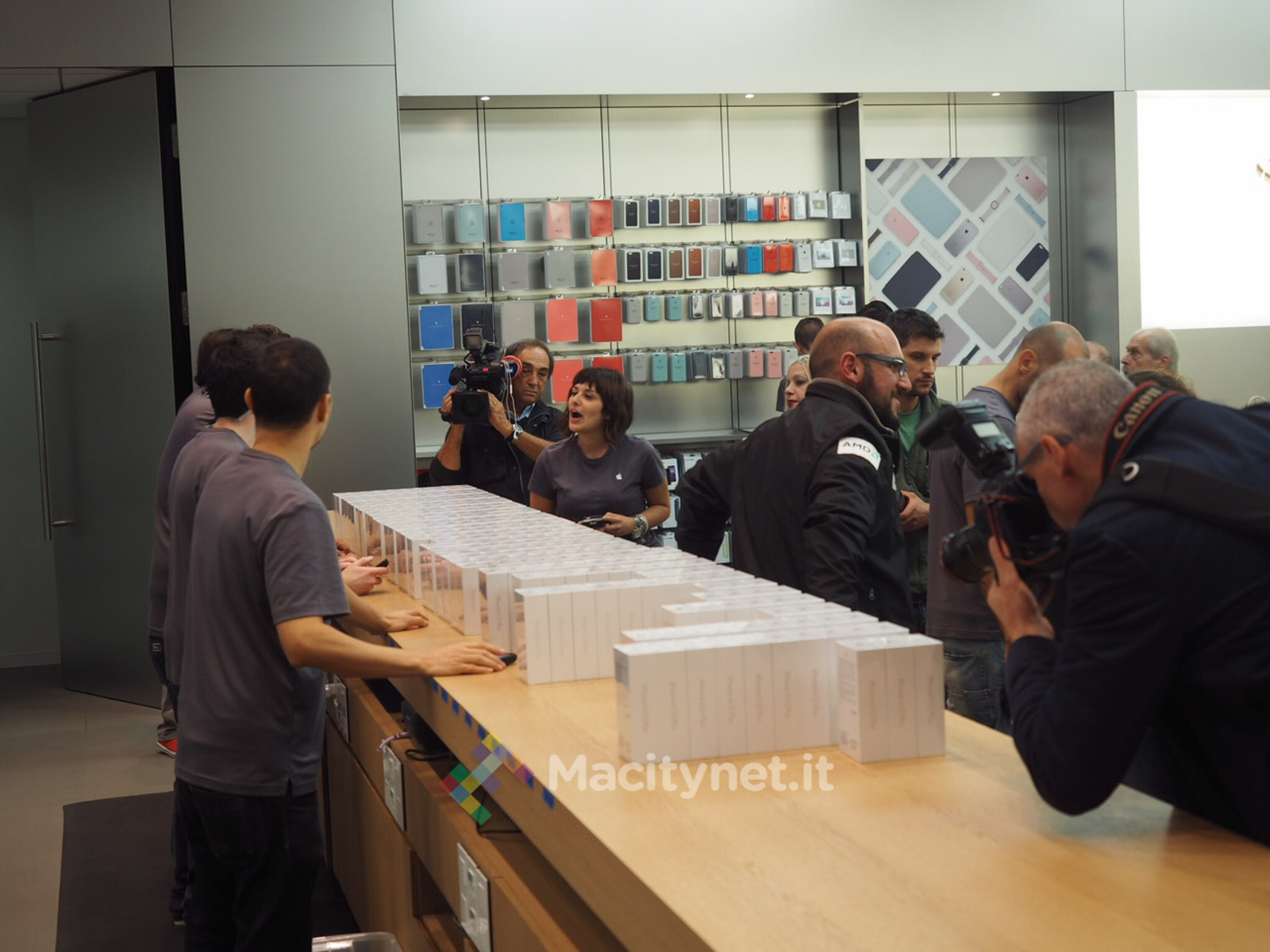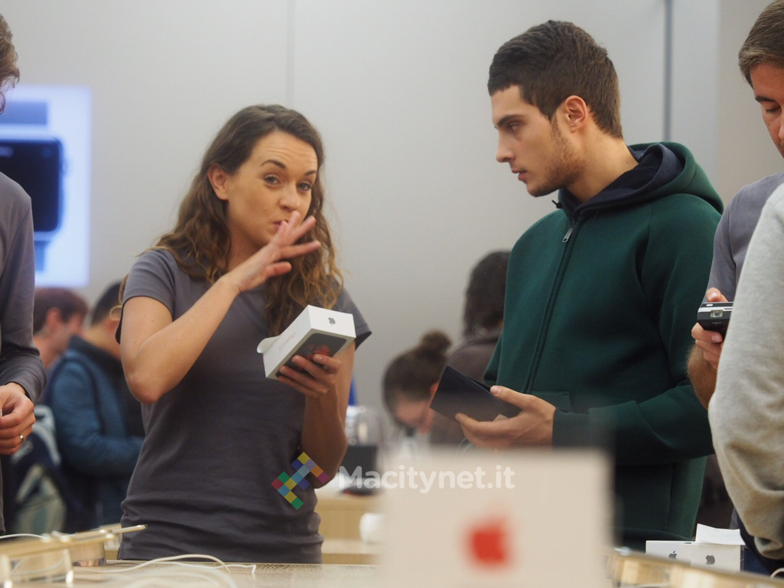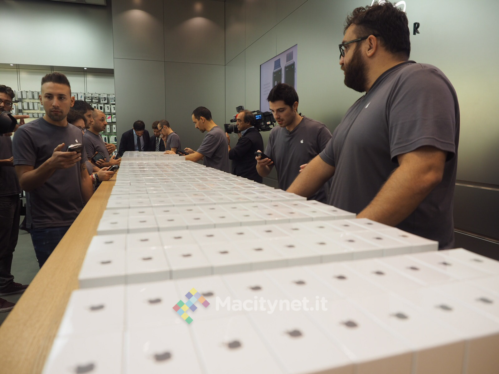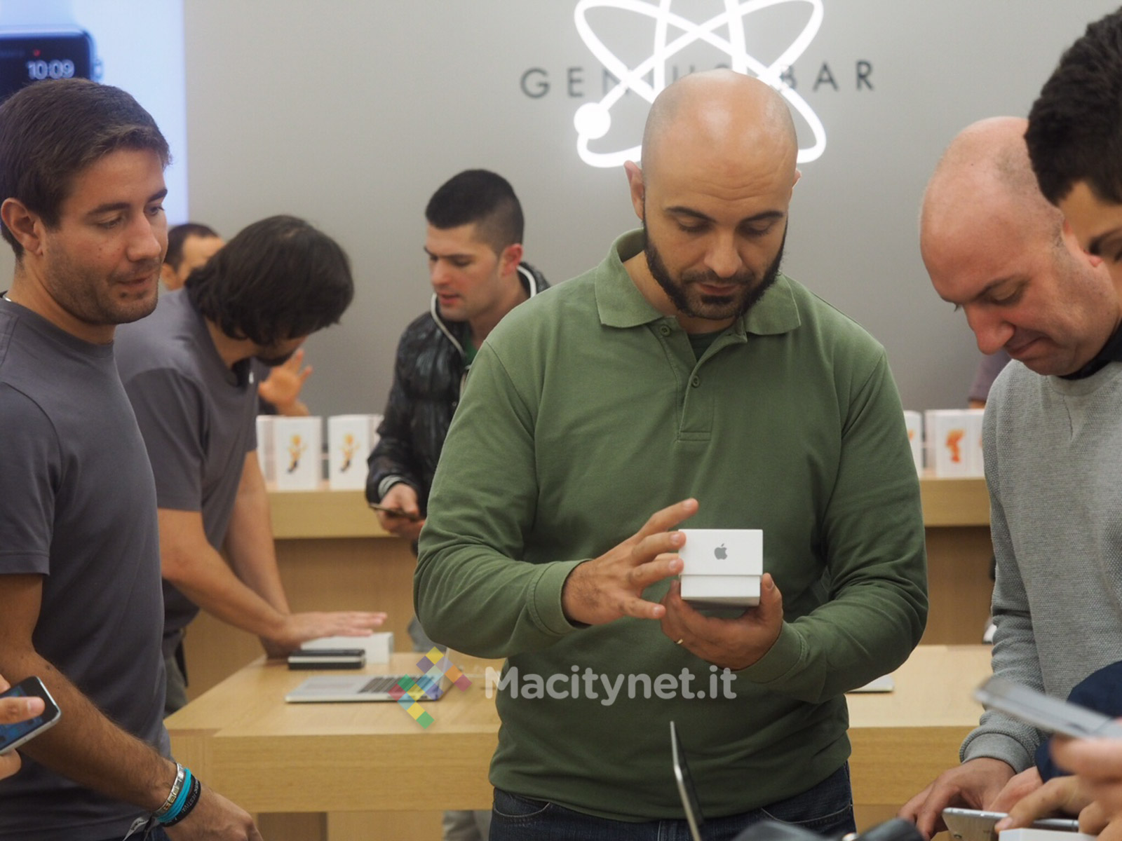 Gli Apple Store di tutta Italia alle 8:00 in punto aprono le porte ed i primi clienti, incitati dal consueto applauso dei dipendenti bene in fila davanti all’ingresso per creare un passaggio, varcano la soglia e si apprestano a raggiungere i banconi di prova o direttamente quello più ampio dell’angolo Genius dove, per l’occasione, sono stati impilati diversi modelli dei nuovi telefoni, pronti per essere consegnati ai primi acquirenti.
