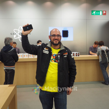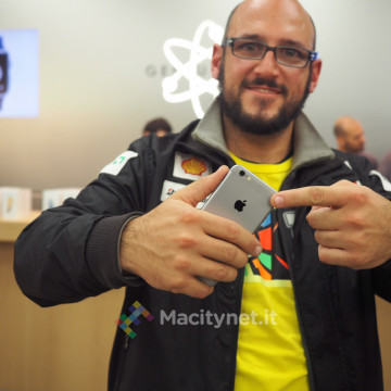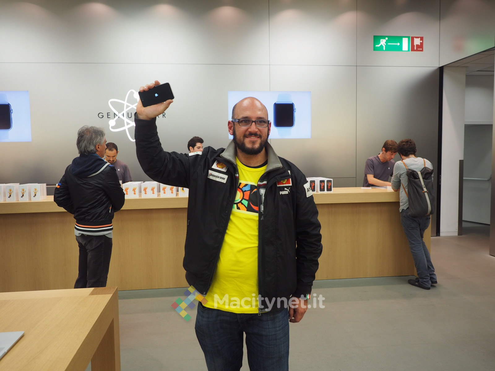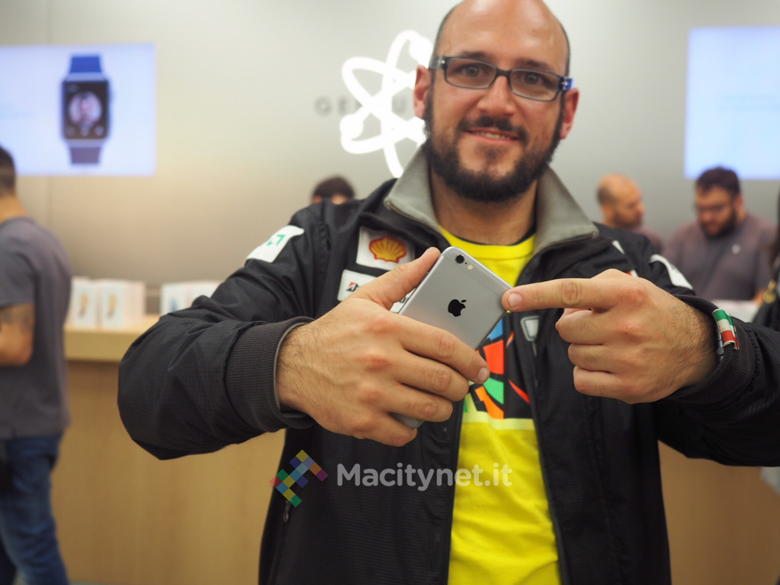Valerio è il primo ad uscire dal negozio con il suo nuovo iPhone 6s grigio siderale, già scartato ed avviato per procedere subito con la configurazione iniziale, quella che porterà all’attivazione del telefono e la conseguente esplorazione di tutte le novità, tra cui lo schermo 3D Touch che porta l’interazione con il touchscreen ad un livello superiore ed alla nuova fotocamera da 12 MP che combina una nuova tecnologia di acquisizione di fotografie “animate”.