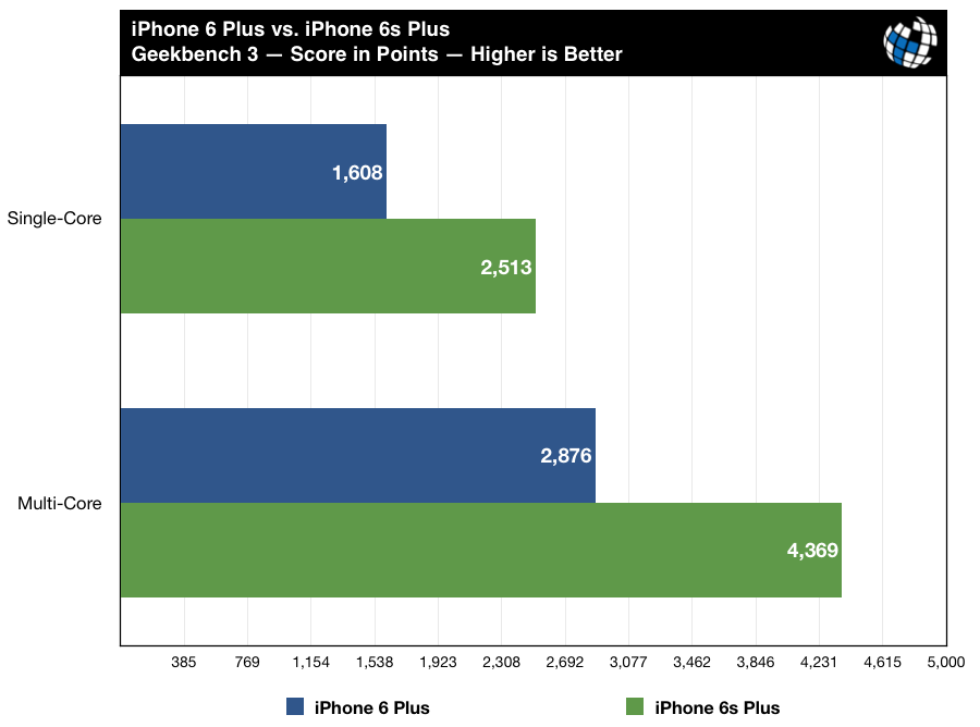 Un anno di differenza tra i due prodotti si fa sentire, con il nuovo smartphone che vanta non solo la CPU A9 ma anche 2GB di RAM permettendo nei test con Geekbench di ottenere un punteggio superiore del 56.3% maggiore nei task single-core e del 51.9% nei tast multi-core, valori incredibilmente simili a quelli di alcuni Mac entry level.
