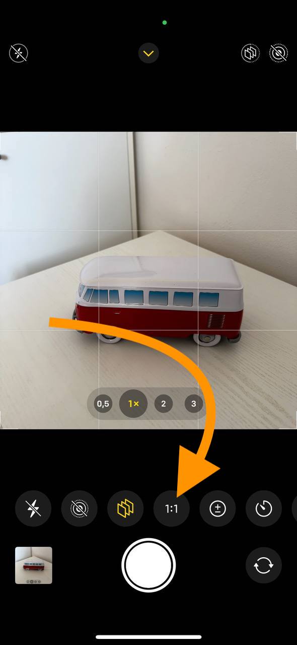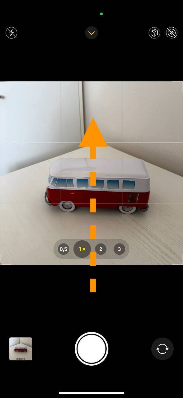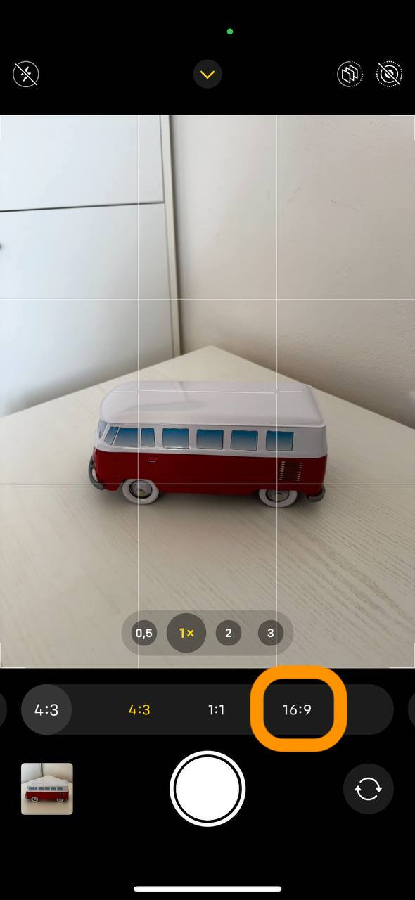 Eventualmente potete anche cambiare il rapporto d’aspetto impostandolo a 16:9 (sempre strisciando verso l’alto per aprire la barra degli strumenti secondari) così, rispetto ai 4:3 selezionati per impostazione predefinita, vi permette di fotografare una scena ancora più ampia.