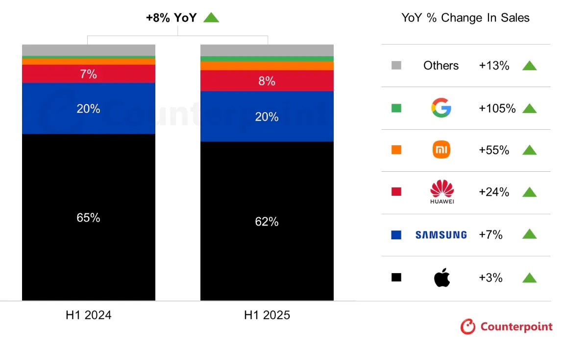 Il mercato smartphone premium a livello globale è cresciuto dell’8% anno su anno nella prima metà (H1) del 2025, arrivando al livello più alto mai raggiunto nell’H1.