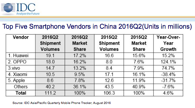 Apple continua a perdere terreno in Cina: secondo i recenti dati di IDC sul mercato smartphone cinese Apple ha spedito nel secondo trimestre del 2016 circa 8,6 milioni di iPhone in Cina, contro i 12,6 milioni di telefoni spediti nello stesso periodo dello scorso anno, per un calo complessivo di quasi il 32 per cento anno su anno.