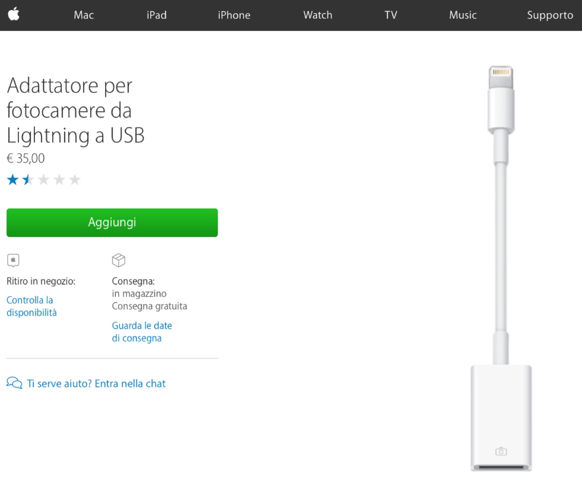 Nel nuovo adattatore per fotocamere da Lightning a USB, non è presente USB 3.0. Negli USA Apple ha già aggiornato la scheda tecnica mentre il codice di questo accessorio risulta nuovo, con la sigla MD821ZM/A diverso codice della versione precedente: quest’ultima è al  al momento disponibile sul sito Apple Store Italia e l’abbiamo provata con iPhone senza problemi collegando lettori USB, iPad Pro e fotocamere: per il funzionamento è necessario avere installato iOS 9.2. Il prezzo non cambia: nel nostro Paese sarà di 35 euro anche per il nuovo modello appena disponibile.