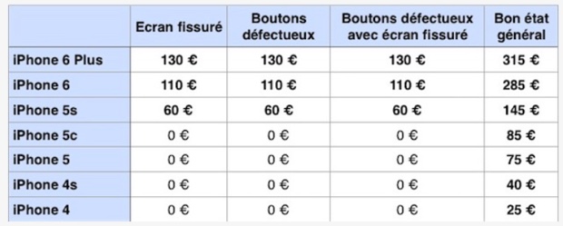 Non solo: il sito d’Oltralpe pubblica una tabella in cui vengono mostrate le valutazioni di iPhone rotto o perfettamente sano, vale a dire l’importo in denaro che Apple concede all’utente per il ritiro del vecchio smartphone per l’acquisto di uno nuovo. Come è possibile osservare dalla tabella il valore di un iPhone 6 Plus è di 315 euro se perfetto, ma la valutazione scende drasticamente a 130 euro in presenza di tasti difettosi o schermo rotto oppure per entrambi.