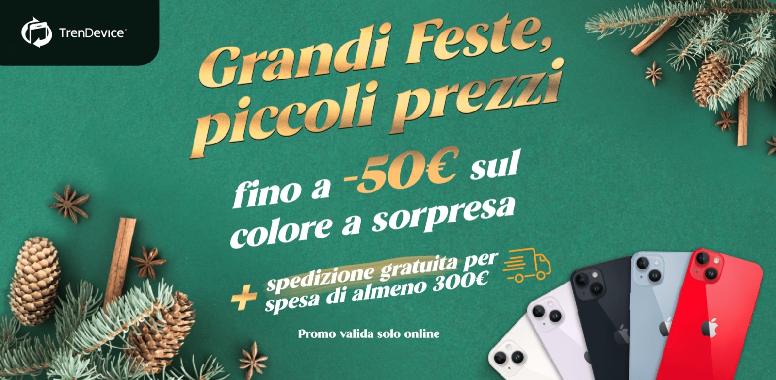 Se state cercando un nuovo iPhone e non avete particolari preferenze per la scelta del colore, su TrenDevice risparmiate fino a 50€ scegliendo il Colore a Sorpresa. Cosa significa? Nella scheda prodotto, selezionando l’opzione “Colore a Sorpresa”, riceverete l’iPhone a seconda del colore disponibile a magazzino. È un’occasione da non perdere perché i prezzi del Colore a Sorpresa, fuori promozione, sono sempre i più convenienti ma TrenDevice li ha abbassati ulteriormente e potete risparmiare fino a 50€. Inoltre, per spesa di almeno 300€, avete anche la Spedizione Gratuita.