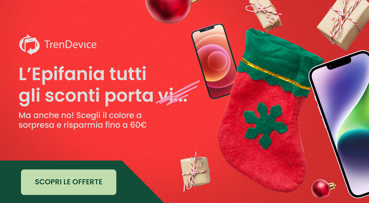 Se state cercando un nuovo iPhone e non avete particolari preferenze per la scelta del colore, questa promozione è pensata proprio per voi! Solo fino al 6 Gennaio su TrenDevice risparmiate fino a 60€ scegliendo il Colore a Sorpresa. Cosa significa? Nella scheda prodotto, selezionando l’opzione “Colore a Sorpresa”, riceverete l’iPhone a seconda del colore disponibile a magazzino. Ricordatevi che potete pagare il dispositivo anche in 3 comode rate mensili senza interessi con Scalapay.