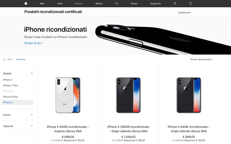 Per la prima volta anche in Italia Apple propone iPhone X ricondizionati a prezzi scontati su Apple Store online. Nelle scorse ore la sezione dedicata agli iPhone ricondizionati è stata popolata per la prima volta con modelli in offerta a prezzi scontati, per lo più iPhone 7, iPhone 8 e iPhone 8 Plus di cui abbiamo parlato in questo articolo.