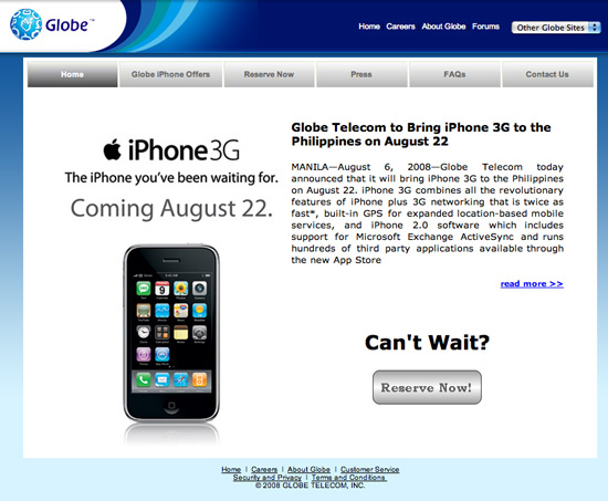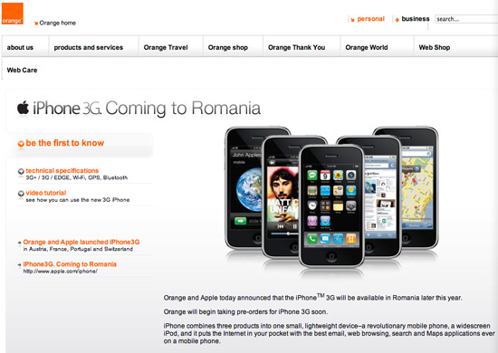 Una pagina dedicata a iPhone anche per l’operatore EMT dell’Estonia in cui vengono riproposti i principali contenuti informativi, il video di introduzione e anche la scheda tecnica di iPhone realizzati da Apple. Per quanto riguarda la Romania Apple e Orange hanno congiuntamente annunciato che lo smartphone sarà commercializzato nel paese più tardi quest’anno. Si precisa che presto inizierà il processo di pre-ordinazione da parte dell’operatore ma senza specificare una data di lancio precisa. Nelle Filippine iPhone approderà subito il 22 agosto e, dalla pagina dedicata a iPhone dell’operatore Globe è già possibile prenotarlo.