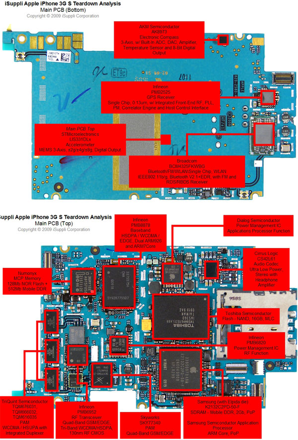 Qui sotto una immagine di iSuppli che mostra la collocazione delle componenti sulla scheda madre e assegna funzioni e produttori.
