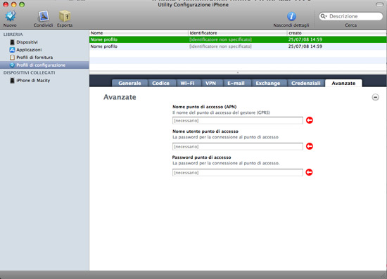 La seconda soluzione per impostare l’APN di nostro gradimento viene offerta direttamente da Apple con il programma iPhone Configuration Utility 1.0 per Mac. Una volta scaricato il file di 2,29 MB e installato l’applicativo possiamo creare tutti i profili iPhone che desideriamo con una interfaccia punta e clicca facile da usare per impostare VPN, impostazioni Wi-Fi, account di posta, certificati, permessi e, tra le numerose altre cose, anche l’APN. Una seconda opportunità , sempre presentata da Apple, viene dalla iPhone Configuration Web Utility 1.0 for Mac (ma esiste anche la versione per Windows ); si tratta di un’applicazione web che risponde all’indirizzo localhost:3000 (da lanciare da un browser Internet) che permette tutte le configurazioni di Configuration Web Utility