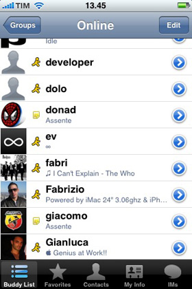 AIM è il programma di messaggistica istantanea sviluppato da AOL. Supporta AIM, Mobileme e .mac, i protocolli usati da iChat, la nota applicazione di chat preinstallata sui Mac. AIM non consente l’invio nè la ricezione di contenuti multimediali (immagini e suoni) e nel momento in cui scriviamo l’utilizzo in landscape è possibile solo con la versione a pagamento. A dispetto delle sue funzioni limitate rispetto ad altre applicazioni di messaggistica, gode per contro di buona velocità di connessione e stabilità ed è tra le poche ad aver già implementato la push notification, novità del firmware 3.0, che consente la ricezione dei messaggi ad applicazione chiusa.