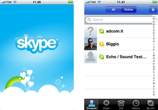 Skype, piattaforma di riferimento per la messaggistica istantanea e il VoiP, sbarca su App Store con un’applicazione che per completezza di funzioni può competere quasi ad armi pari con la controparte su computer, fatta eccezione ovviamente per la videochat non possibile su iPhone e iPod touch. Skype consente di chattare con i contatti online via testo e audio, usando il melafonino come se si effettuasse una qualsiasi telefonata. Mediante il servizio a pagamento SkypeOut è possibile effettuare chiamate internazionali e su cellulari con tariffe particolarmente vantaggiose. Purtroppo non si possono in atto inviare e ricevere files (immagini, suoni). Il VoIP è possibile solo via WiFi: non si tratta di un difetto dell’applicazione ma di una limitazione decisa da Apple e verosimilmente dalle compagnie telefoniche.