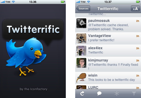 Twitterrific è un social network che consente, mediante messaggi della lunghezza massima di 140 caratteri chiamati “tweet”, di informare rapidamente i propri amici su quanto si stia facendo in un determinato momento . L’applicazione Twitterrific è uno dei migliori client Twitter e permette con facilità l’inoltro dei “tweet” che possono essere arricchiti dalle coordinate mediante la geolocalizzazione e da foto scattate al volo con iPhone o scelte dalla libreria . E’ possibile gestire più account, effettuare ricerche, inviare messaggi personali, accedere a tweet su argomenti di particolare interesse (trend), modificare l’aspetto dell’interfaccia. La grafica è piuttosto curata e condita di effetti video e audio.