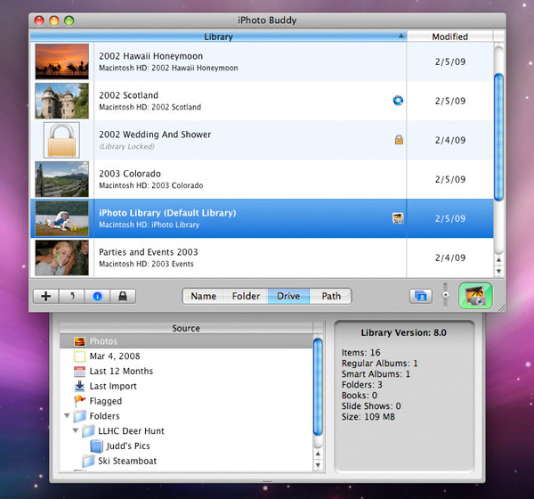 iPhoto Buddy è un’applicazione gratuita Universal Binary (nativa per Mac con CPU PowerPC e Intel) per Mac OS X che consente la creazione, gestione e lo switch tra librerie multiple di iPhoto. Invece di avere un’unica grande libreria, è possibile creare librerie multiple e migliorare le performance e la flessibilità del software Apple organizzando le proprie raccolte in modo più consistente e semplificato, utile soprattutto se abbiamo la necessità di gestire grandi quantità di foto con macchine un po’ datate.