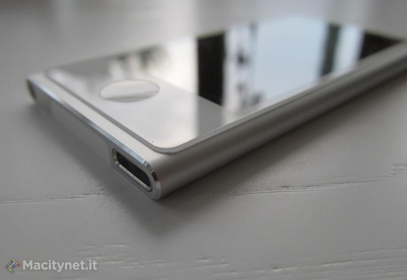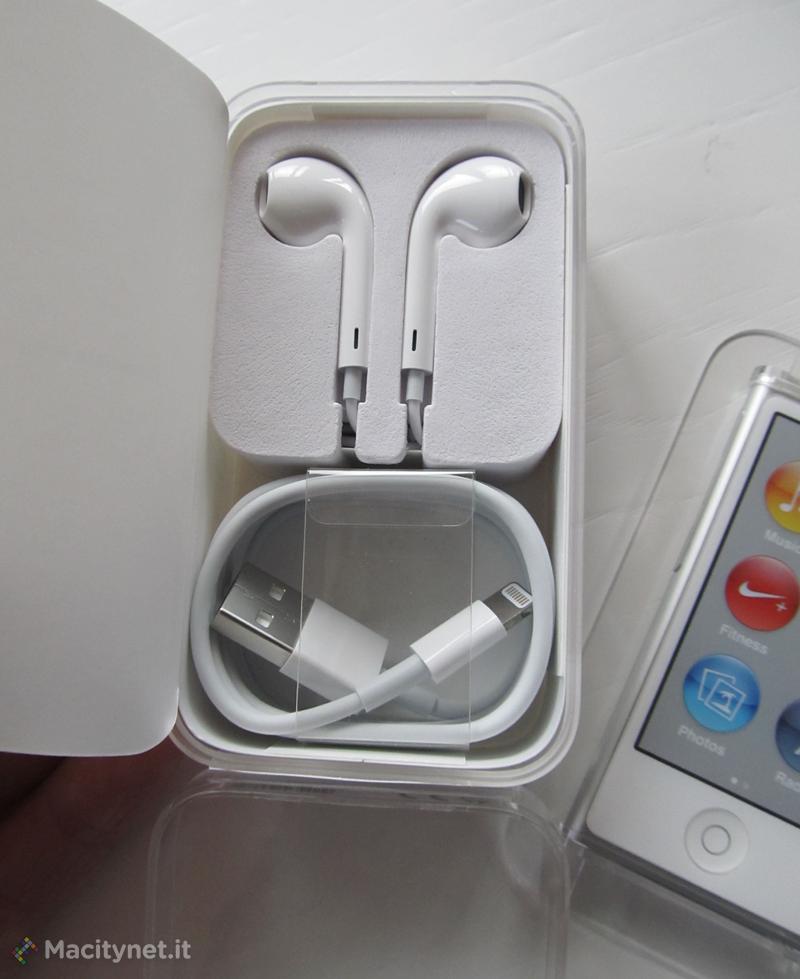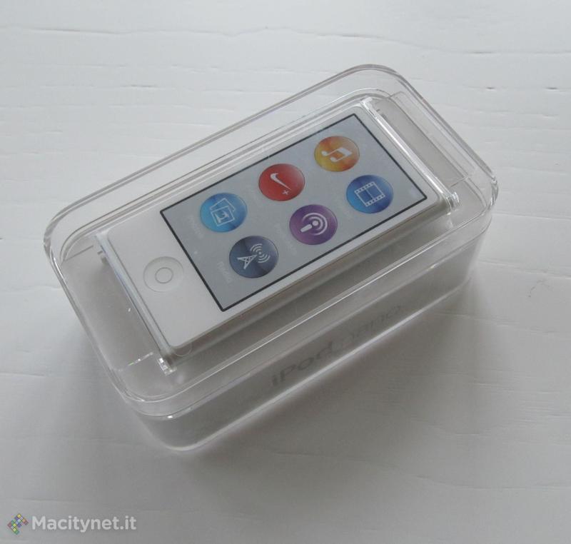 La confezione mette in risalto le ridotte dimensioni del nuovo nano touch ancora più sottile grazie al dock Lightning