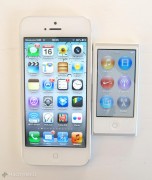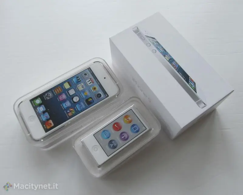 iPhone 5 nella sua scatola in cartone e i due iPod (touch e nano touch) nella classica confezione trasparente.