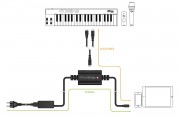 iRig PowerBridge in sostanza supera questo ostacolo in quanto si interpone tra iPhone/iPad e strumento musicale aggiungendo la possibilità di alimentare, e quindi ricaricare, il dispositivo iOS. Da un’estremità troviamo infatti l’alimentatore che si collega alla presa di corrente, dall’altro il connettore Lightning o 30 pin: nel mezzo, la porta MIDI per collegare lo strumento musicale attraverso l’apposito accessorio iRig.