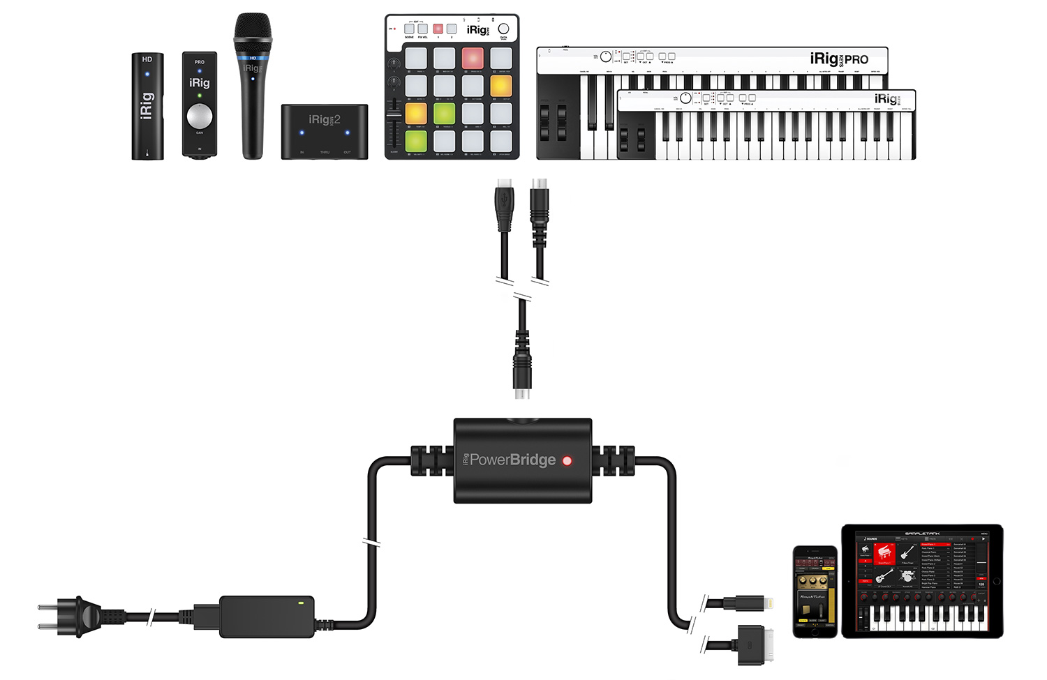 iRig PowerBridge in sostanza supera questo ostacolo in quanto si interpone tra iPhone/iPad e strumento musicale aggiungendo la possibilità di alimentare, e quindi ricaricare, il dispositivo iOS. Da un’estremità troviamo infatti l’alimentatore che si collega alla presa di corrente, dall’altro il connettore Lightning o 30 pin: nel mezzo, la porta MIDI per collegare lo strumento musicale attraverso l’apposito accessorio iRig.