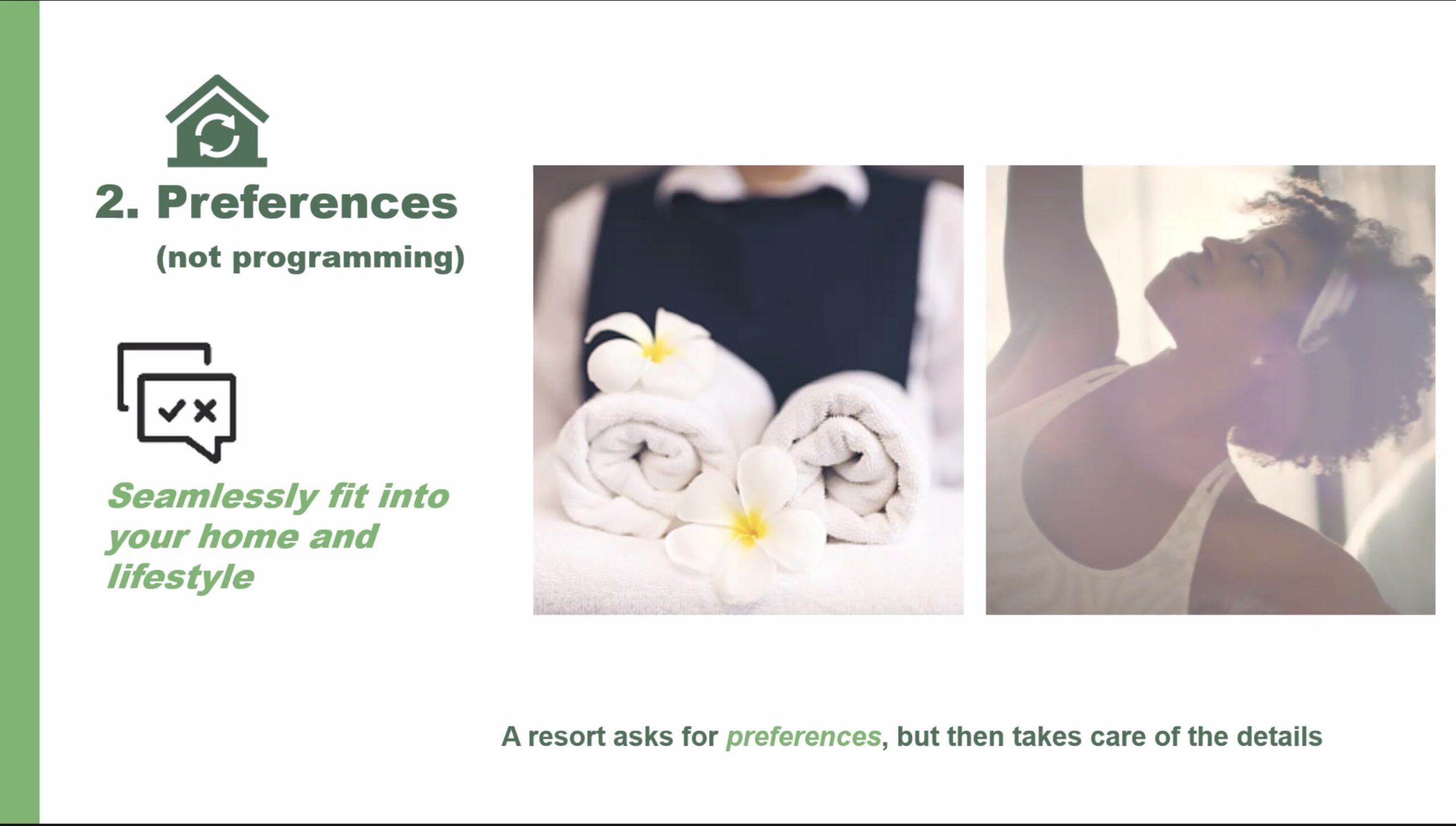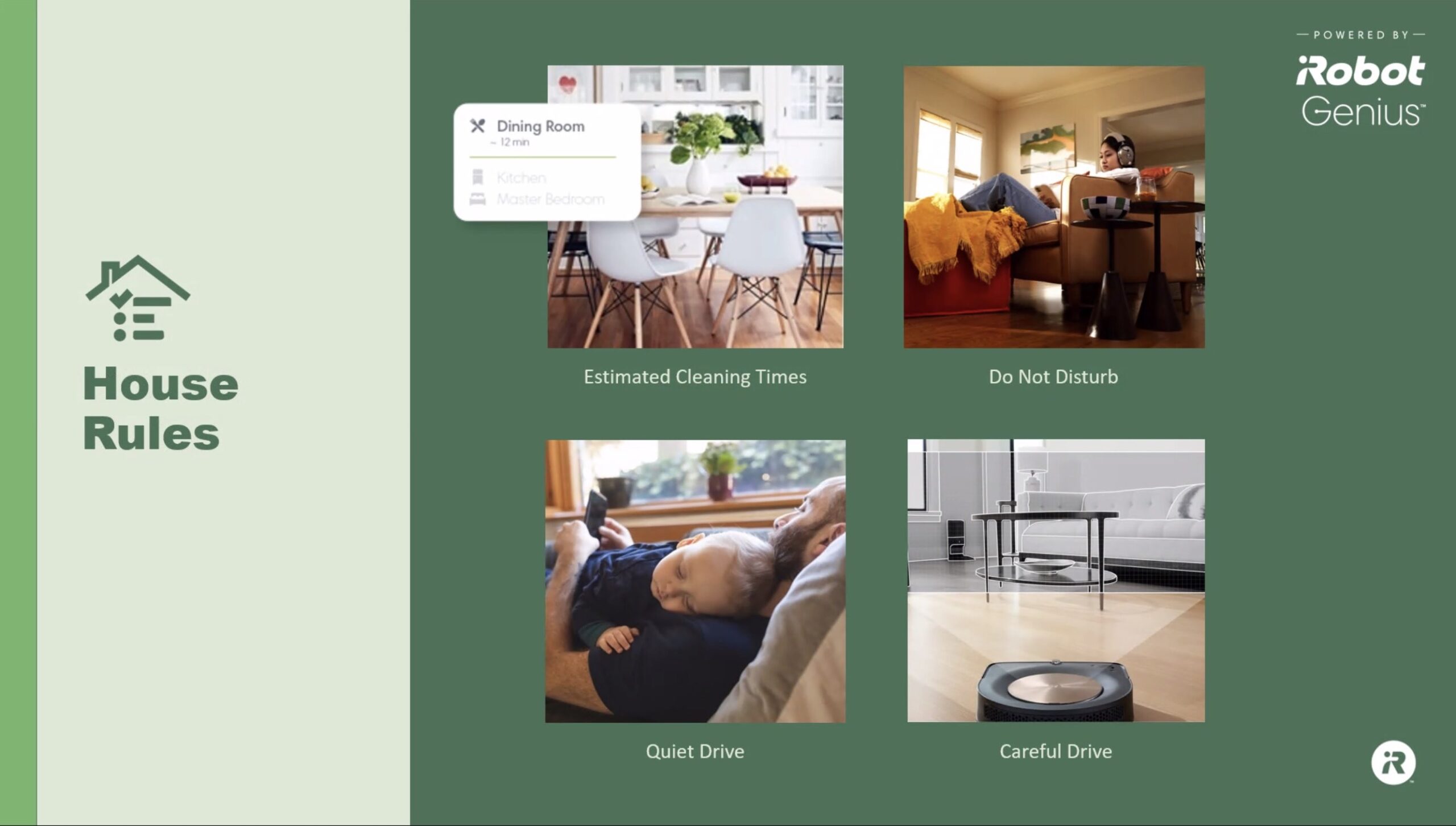 Qiui sotto quelle che sono le regole che a cui gli utenti della casa e i robot dovrebbero adeguarsi: tempi di pulizia, momenti di quiete (la notte o durante la visione di un film o di riposo di un bimbo) e attenzione agli oggetti della casa.