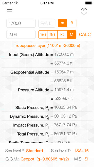 ISA Calc Pro è un’app universale ottimizzata sia per iPhone che per iPad pensata per ingegneri aeronautici ed aerospaziali che permette di calcolare parecchie proprietà atmosferiche quali Pressione, Densità, Temperatura ed altre a partire da una quota di input. É inoltre possibile inserire una velocità ed una lunghezza di riferimento (ad esempio una corda alare) che insieme permettono di aumentare considerevolmente le grandezze calcolate e restituite come output dall’applicazione.