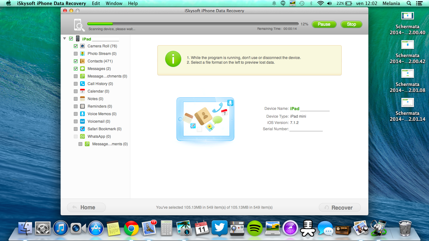 iSkysoft iPhone Data Recovery permette disalvare qualsiasi dato sul proprio Mac. Attraverso il pulsante verde Recover presente in basso, iSkysoft iPhone Data Recovery creerà automaticamente una cartella sul proprio disco fisso, all’interno della quale saranno presenti ulteriori cartelle, contenenti i vari file recuperati e suddivisi per categoria. Le immagini, e più in generale i file multimediali, saranno immediatamente visibili su Mac attraverso classici software, come Anteprima o QuickTime, mentre i file di testo vengono salvati con estensioni particolari, visibili con Excel o Safari e comunque facilmente ripristinabili sul dispositivo. Ad esempio, i contatti vengono salvati in formato CSV o VCF, oltre ad una versione HTML, così da poter essere subito visualizzati su un qualsiasi web browser. Anche i messaggi e il calendario vengono salvati in versione HTML, così da poterne subito consultare il contenuto da Mac. Ovviamente, esistono innumerevoli applicazioni gratuite per importare questi dati su un nuovo dispositivo iOS.
